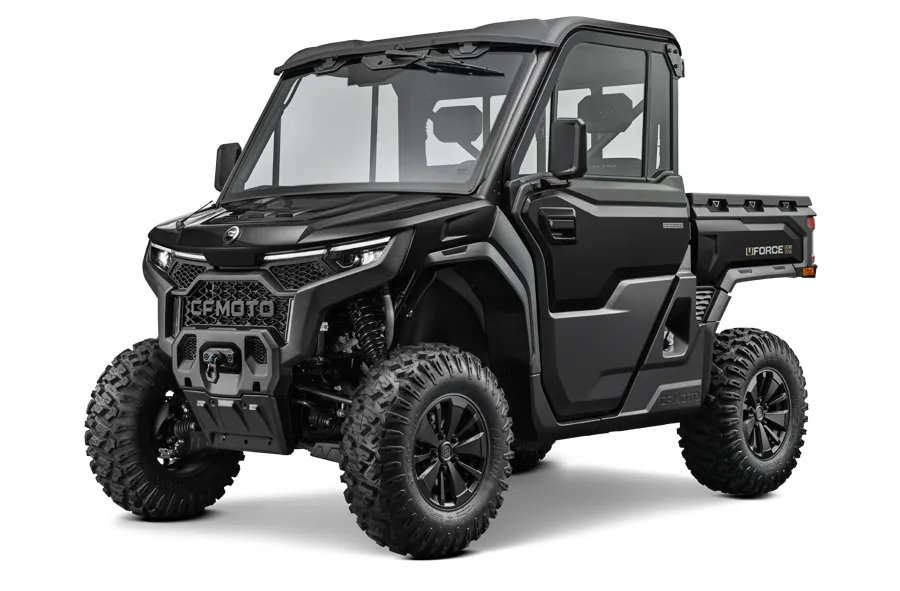 Electronic power steering, Bosch® EFI, electronic throttle with work/normal modes, OmniDrive™ CVT, 4500 lb. winch with synthetic rope, 3-person bench seats, CFMOTO LED™ headlights/taillights with backup lights, tilt steering wheel, CFMOTO RideSync app compatible (T-Box), 12V outlet, USB port, push button shifting and starting, nfc key, 8” CFMOTO RideSync™ touchscreen display, electronic / hydraulic tilt bed, skid plate, front & rear sway bars, Hill Descent Control, locking front and rear differential, side rear view mirrors, roof with headliner, bus bar, 2” receiver, adjustable driver seat, audio package, power glass tip out windshield with wiper, sliding rear glass window, full locking doors with power glass windows, factory installed HVAC,150amp charging system