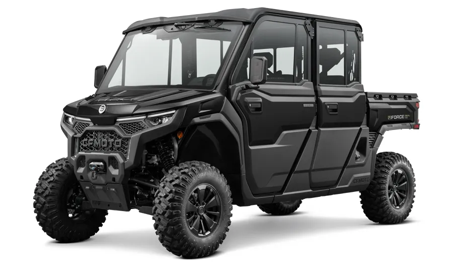 Electronic power steering, Bosch® EFI, electronic throttle with work/normal modes, OmniDrive™ CVT, 4500 lb. winch with synthetic rope, two 3-person bench seats, CFMOTO LED™ headlights/taillights with backup lights, tilt steering wheel, CFMOTO RideSync app compatible (T-Box), 12V outlet, USB port, push button shifting and starting, nfc key, 8” CFMOTO RideSync™ touchscreen display, electronic / hydraulic tilt bed, skid plate, front & rear sway bars, Hill Descent Control, locking front and rear differential, side rear view mirrors, roof with headliner, bus bar, 2” receiver, adjustable driver seat, audio package, power glass tip out windshield with wiper, sliding rear glass window, full locking doors with power glass windows, factory installed HVAC, 150amp charging system